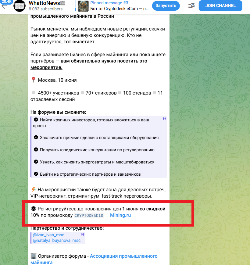 У проекта Whattominebot есть тг-сообщество, на которое подписано 8 тысяч пользователей. Посты читают 1-1.5 тыс. из них, что говорит о привлечении ботов.