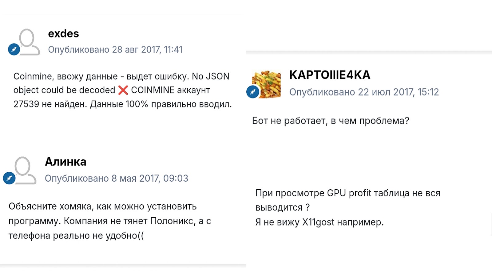 Встречаются негативные отзывы о том, что бот Whattomine bot не работает, а также при вводе данных выдаются ошибки.