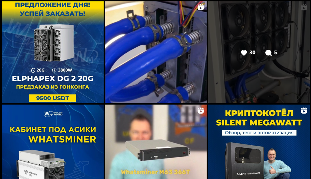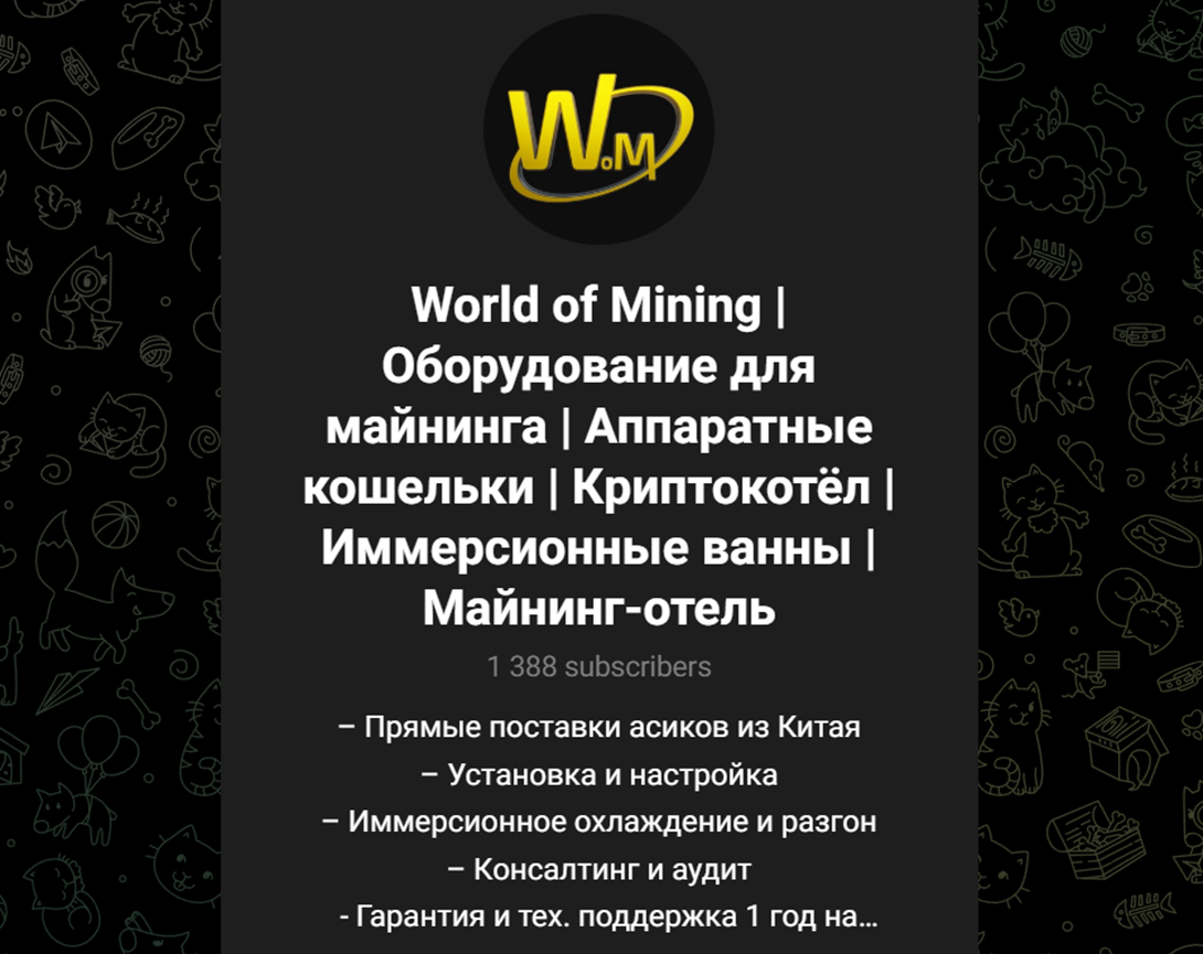 В телеграм-канале «World of Mining Оборудование для майнинга Аппаратные кошельки Криптокотел Иммерсионные ванны Майнинг отель» набралось 1,3 тысяч подписчиков. Площадка существует с апреля 2023 года. Тут публикуются разные типы продукции с описанием, а также прочий тематический контент. Комментарии для подписчиков открыты, а количество просмотров у последних публикаций составляет около 200.