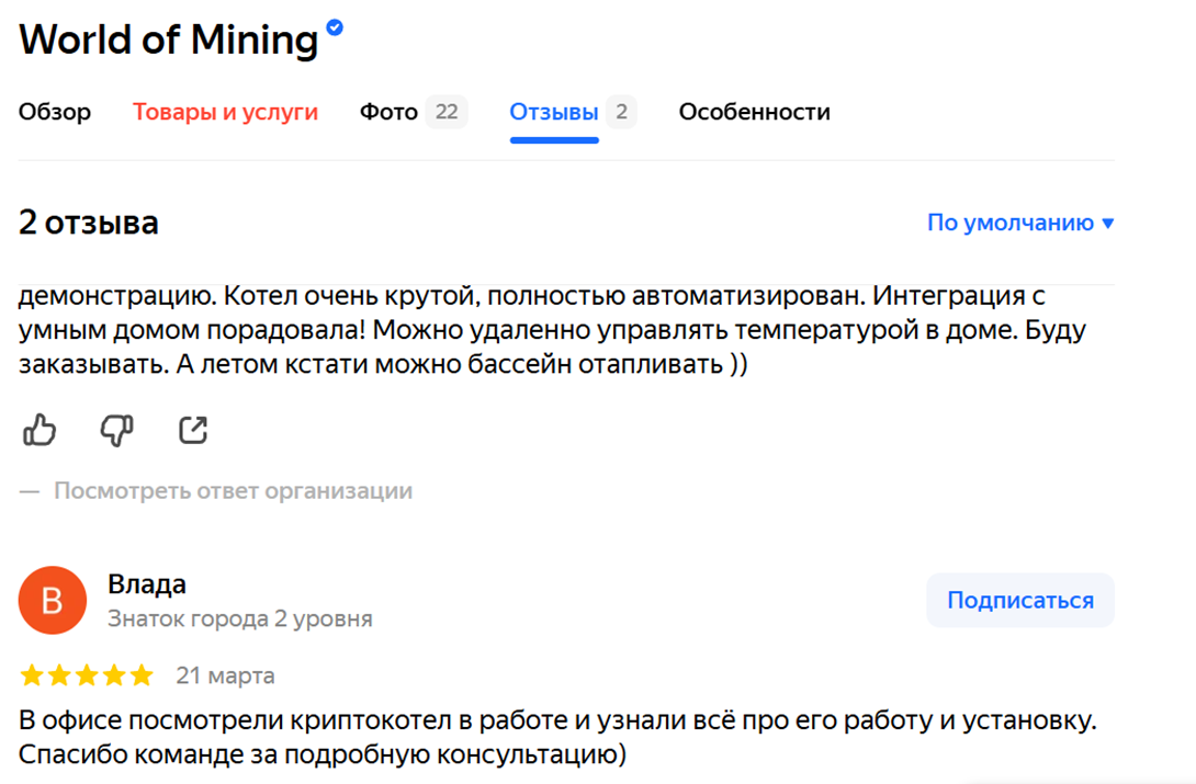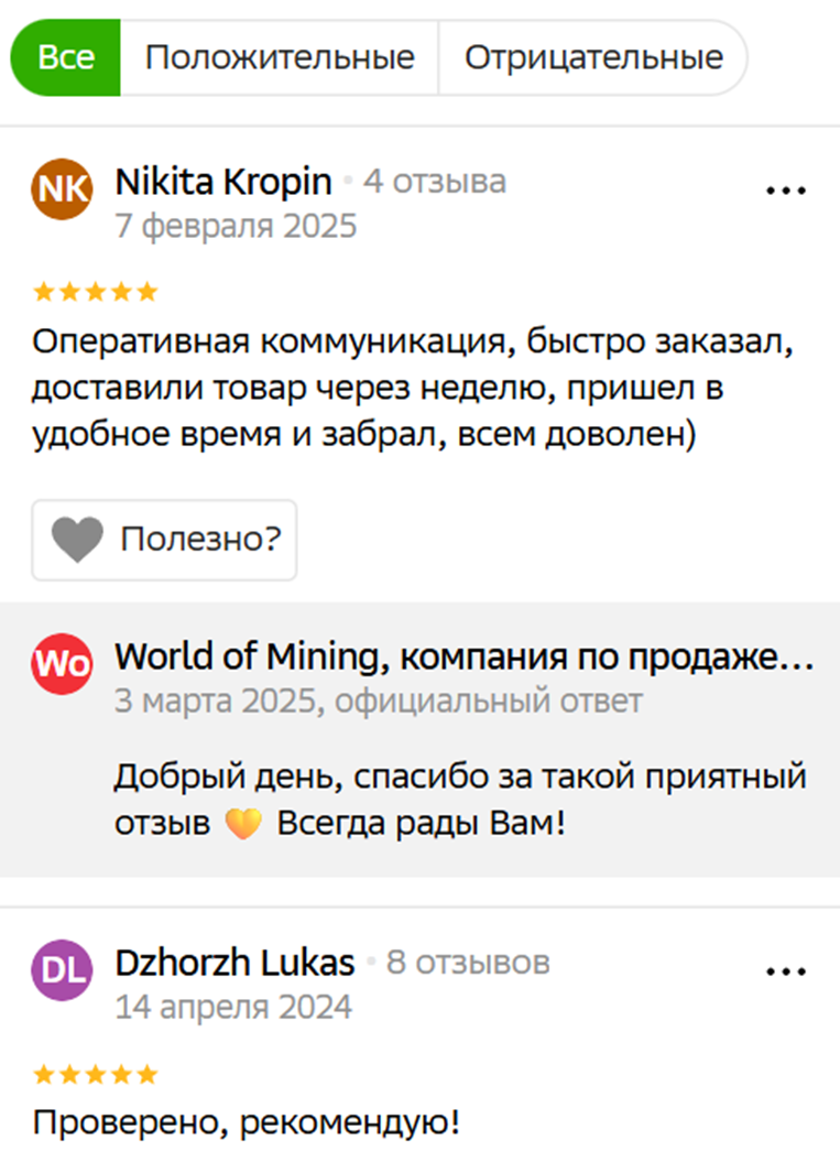 Обнаруженные в сети отзывы о World of mining com показывают компанию с положительной стороны. Люди отмечают возможность посмотреть товар, хорошую консультацию. Также есть положительные отклики об оперативной доставке. Соответственно, все говорит о том, что магазин заботится о своей репутации и старается выполнять заявленные условия.