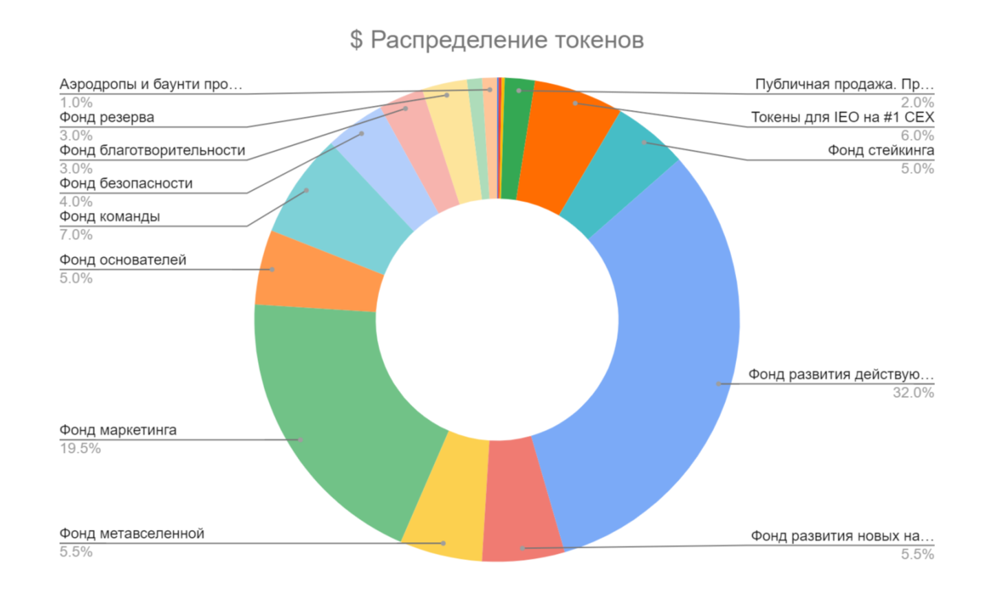 Распределение всех токенов проводится между публичной продажей и рядом фондов: развития, основателей, благотворительности, команды и другими. Кроме того, определенный процент выделяется на публичную продажу, IEO, аирдропы и иные цели. Более подробная информация приводится на рисунке ниже.