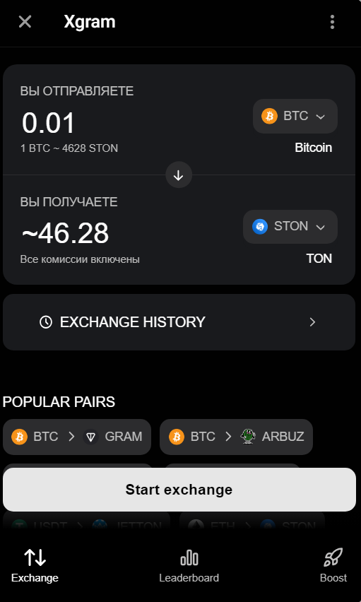 Обменник Xgram Io позволяет покупать и обменивать криптовалюты, а также токены, входящие в экосистему TON. К обмену предлагается широкий спектр всевозможных проектов, которые зарегистрированы на основе блокчейна TON. На них выставлена справедливая и актуальная на всех рынках цена.