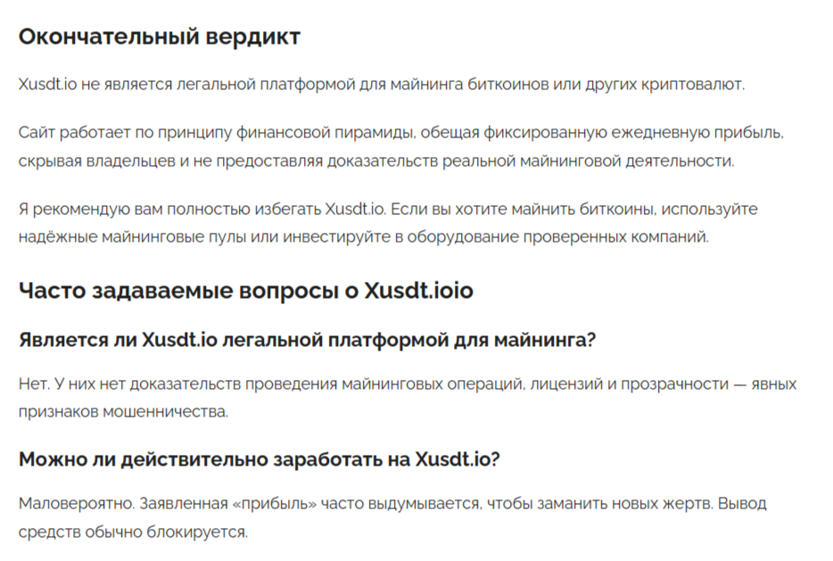 Интернет предоставил нашей команде лишь несколько экспертных статей о проекте на сайте xusdt io. В них эксперты не рекомендуют вкладывать деньги в упомянутое предприятие и просят читателей обходить стороной сомнительную площадку.