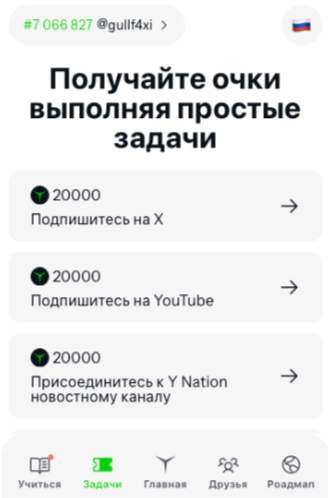 Также в игре Y bot есть квесты, в виде подписок на официальные соцсети проекта по типу аккаунта в X, канала на Ютуб под названием Y Edu или паблика в Telegram. За выполнение каждого, игроки могут получить по 20 000 токенов.