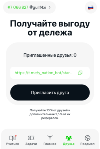 Игроки также могут получать деньги за то, что просто приглашают своих друзей или обычных пользователей в бота Y nation bot. Таким образом, доходы будут зависеть от прибыли ваших рефералов и вы будет получать 10% от них. Также от их рефералов вы будете зарабатывать дополнительные 2,5%.