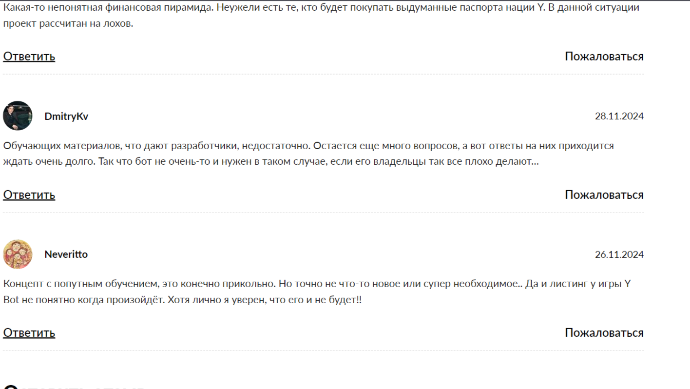 В сети есть полно негативных отзывов о ресурсе Y bot, где игроки говорят о том, что обучающих материалов недостаточно, а также остается много вопросов на которые сложно найти ответы. Также есть те, кто говорит< что проект похож на обычную пирамиду и развод.