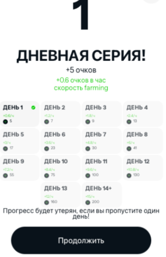 В тапалке также есть своя система ежедневных бонусов, которая расписана 14 дней. Таким образом, игроки могут заходить в игру каждый день и получить до 200 очков.