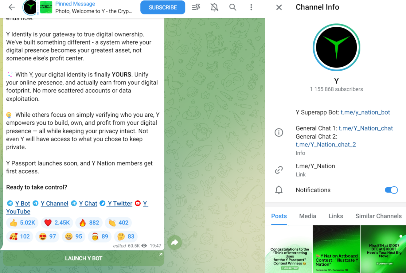 У проекта есть свой паблик в Телеграмм под названием Y, на который подписаны около одного миллиона человек. Тут публикуются разные новости и анонсы по тапалке Y nation bot. Просмотры максимально странные и составляют меньше одного процента. Все это может указывать на то, что команда основателей проекта возможно пользовалась накруткой.