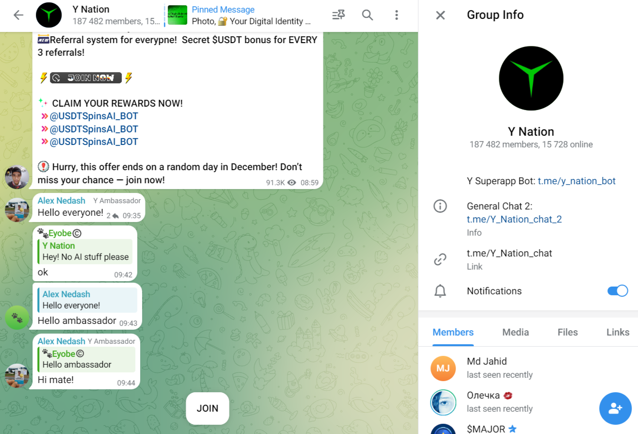 Также у них есть свой чат Y nation chat, в котором присутствуют около 200 000 человек. Однако, активность здесь тоже достаточно низкая, а пользователи чаще всего просто рекламируют скам-проекты и скам-airdrop.