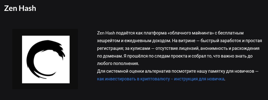 Zenhash Inc — платформа для майнинга, которая обещает ежедневный доход. Под этим именем работает несколько источников, но ни один из них не имеет популярности в сети. Сегодня мы проверим деятельность данной организации и постараемся выяснить, что она предлагает на самом деле и стоит ли с ней сотрудничать.