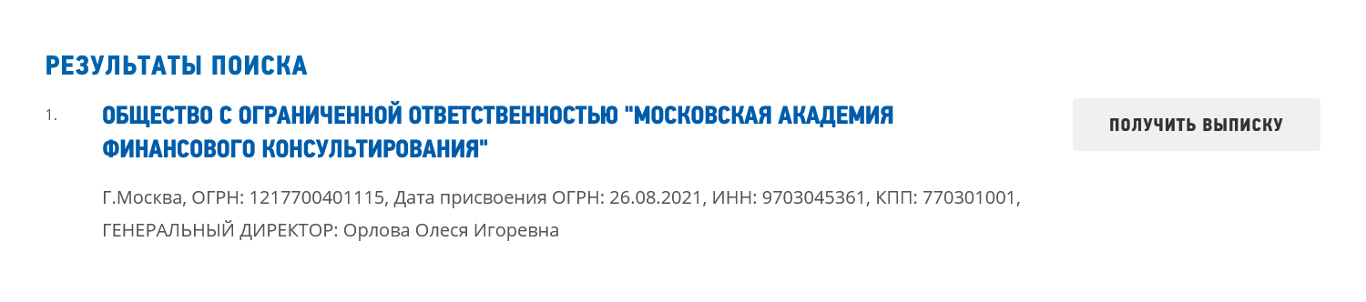 На сайте указано, что онлайн-школа имеет официальное название ООО «Московская академия финансового консультирования», была создана в 2021 году.