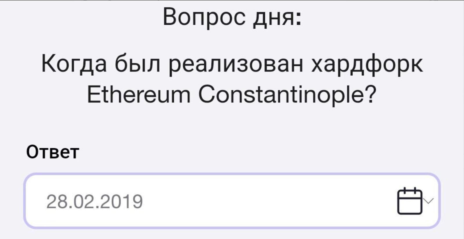 Сегодняшний вопрос: “Когда был реализован хардфорк Ethereum Constantinople?”