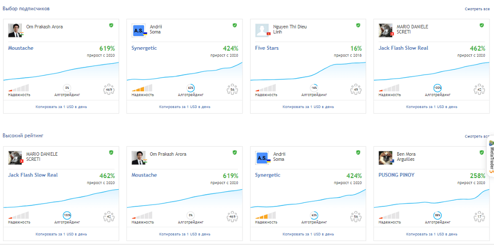 Чтобы выбрать поставщика сигналов, можно воспользоваться удобными фильтрами и отсортировать претендентов по следующим признакам: