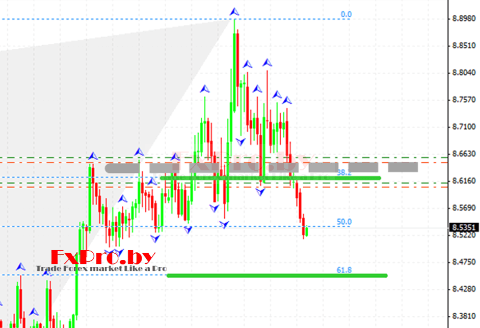 Такая область необходима для получения минимальной прибыли. Область 38.2%, или 61.8% от крайних уровней модели. Если цена развернулась из области разворота, но не может пробить область прибыли, нужно поджимать сделку стопом, чтобы зафиксировать часть прибыли. Это начальная стратегия управления позицией.