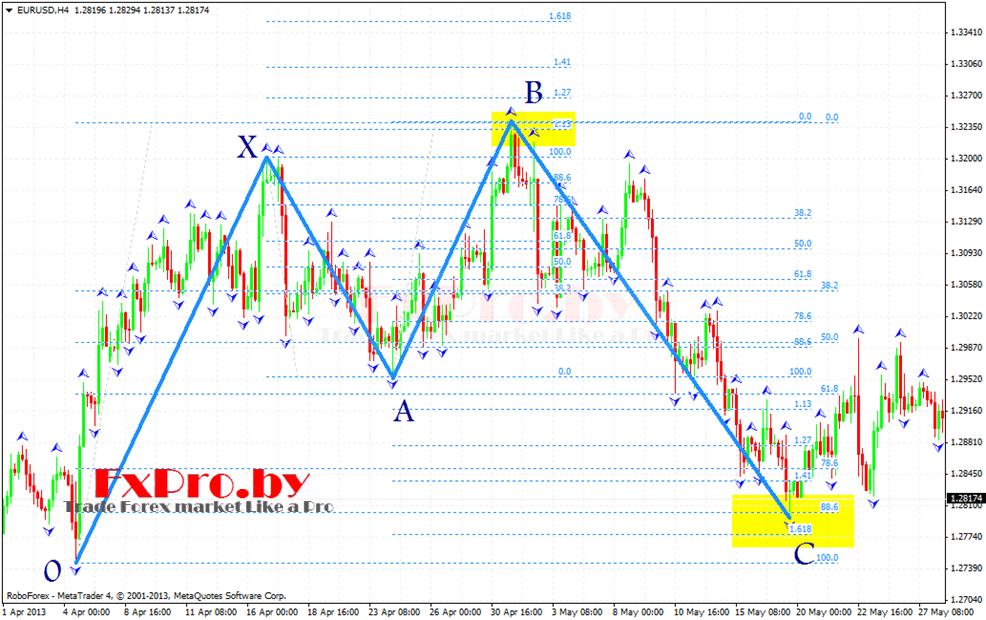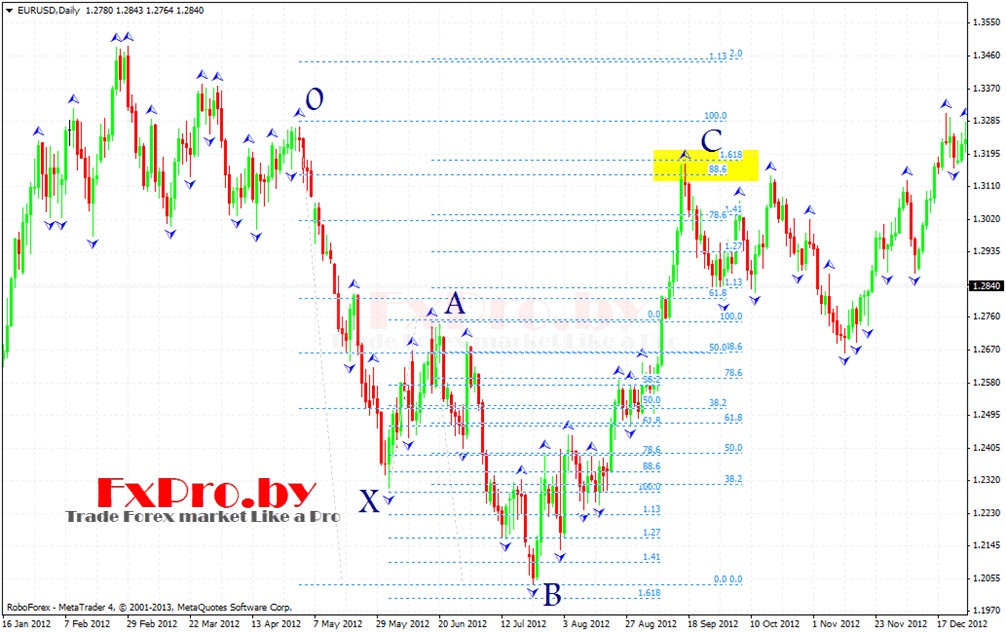 у вас — «точка С – область где мы ожидаем начала разворота вверх, располагается на уровне 0.886 или 1.13 от точки 0 до точки B.»