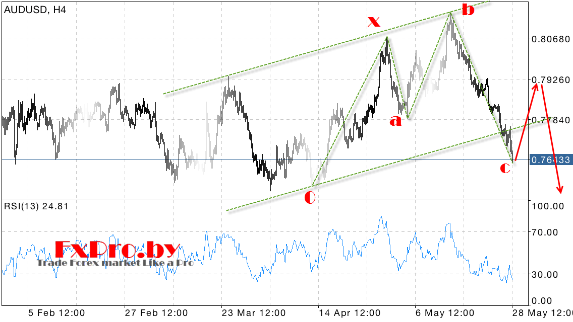 Аналогичная модель только в перевернутом виде. Сначала котировки ставят минимум, затем происходит коррекции, после чего следует обновление минимума в области расширения Фибоначчи от 1.13 до 1.618, затем новая волна роста, которая должна располагаться в области расширения Фибоначчи от 1.618 до 2.24, но больше важна коррекция на уровне 0.886 либо 1.13.