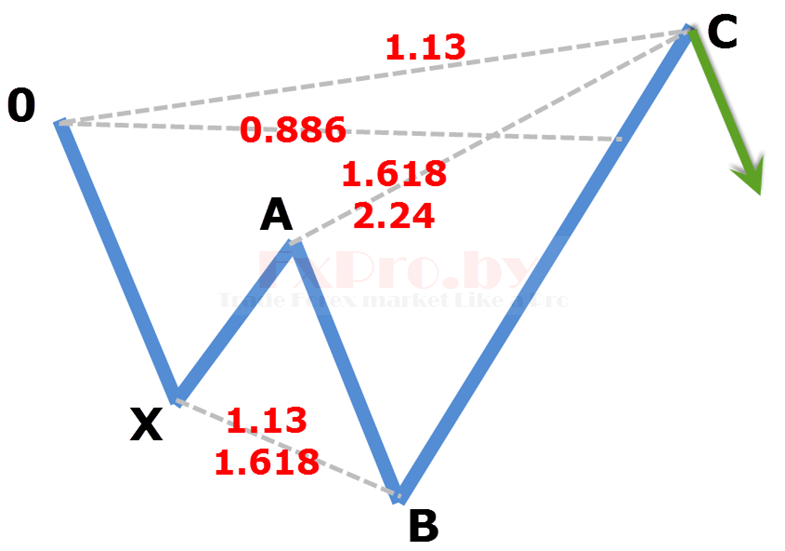 Как видим, точка 0 – является началом формирования модели акула, точка Х — первый максимум, откуда происходит коррекция, точка А – завершение коррекции вниз, точка B – новый максимум, который располагается в области расширения Фибоначчи от 1.13 до 1.618, точка С – область где мы ожидаем начала разворота вверх, располагается на уровне 0.886 или 1.13 от точки 0 до точки B. Также важно, чтобы точка С располагалась на уровне от 1.618 до 2.24 расширения Фибоначчи от точки А до точки B.