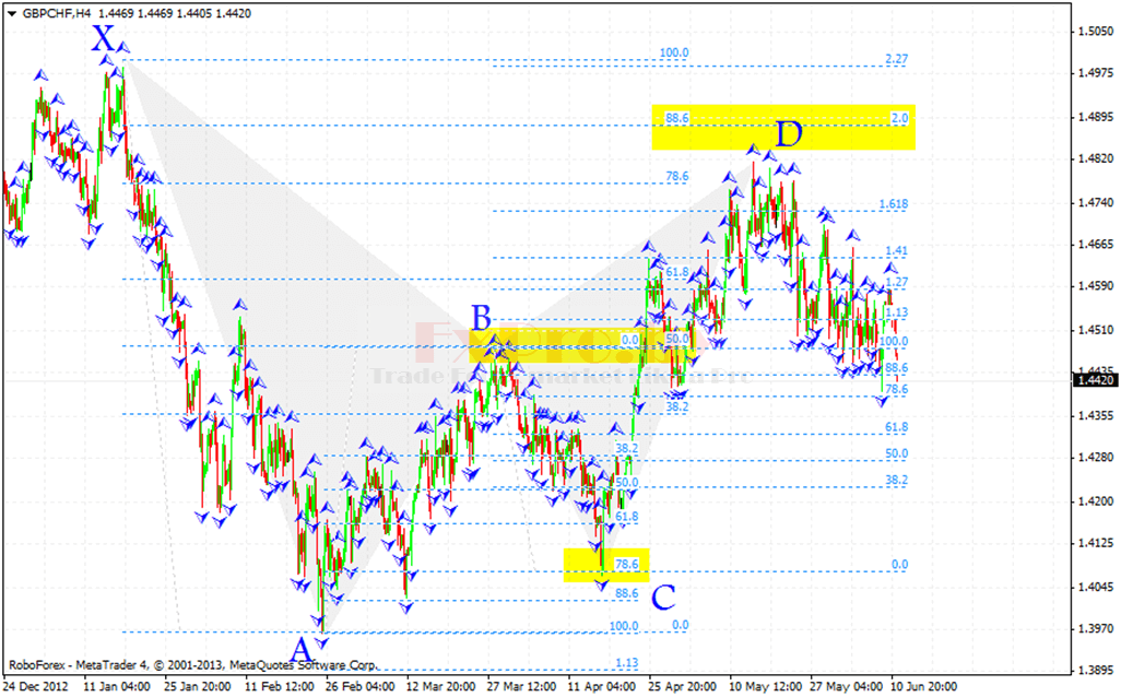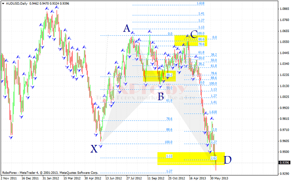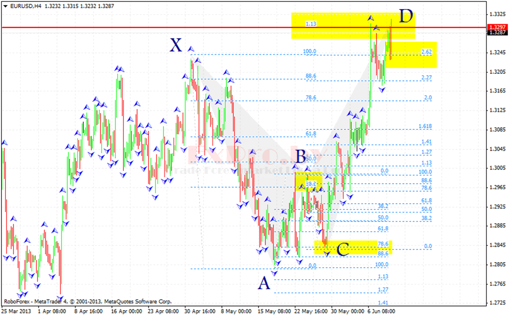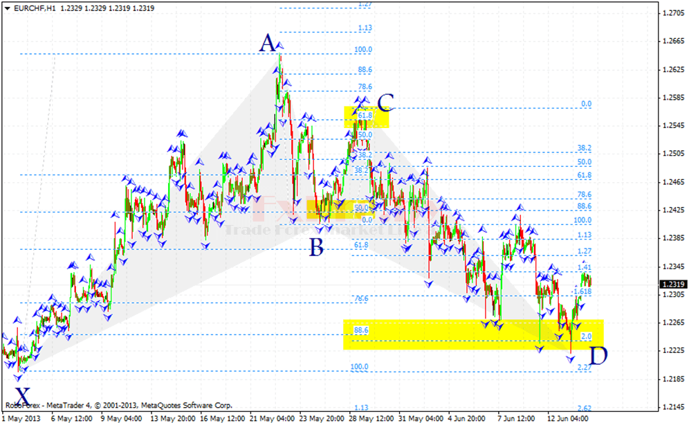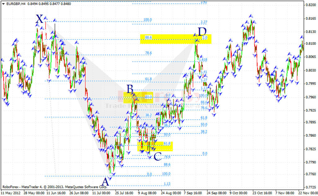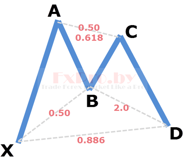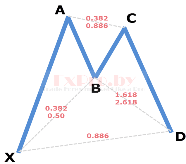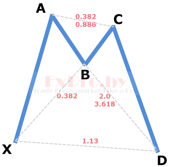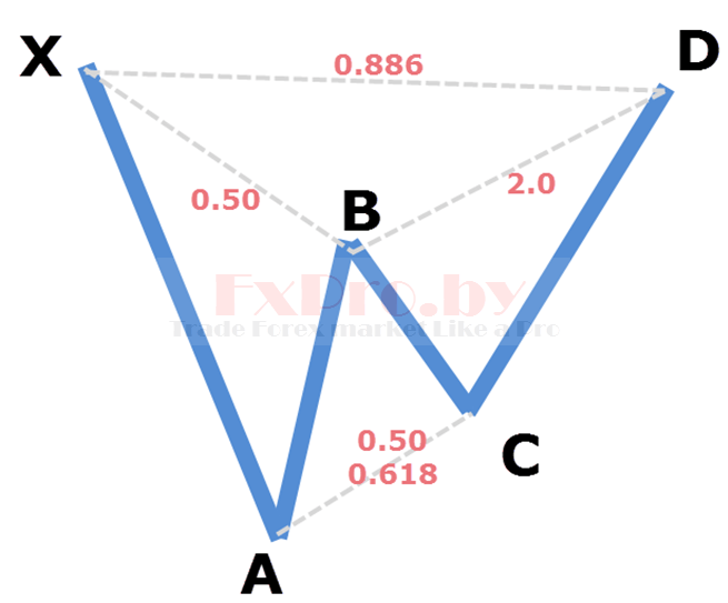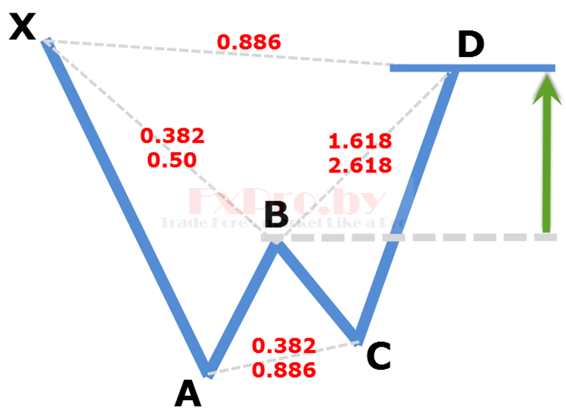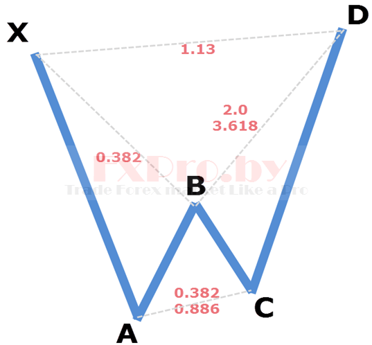Точка X – начало восходящего движения и точка старта всей бычьей модели летучая мышь. Точка A – завершение восходящего движения и начало коррекции, выше точки A рынок не должен подниматься. Точка B – завершение нисходящей коррекции на уровне между 0.382 – 0.5, отсюда начинается восходящее движение. Точка C – завершение восходящего движения на уровне коррекции от движения AB – 0.382 до 0.886. Точка D – завершение нисходящего движения и место формирования потенциальной область разворота, должны быть совпадения уровня коррекции 0.886 от XA и проекции 1.618 – 2.618 от BC.