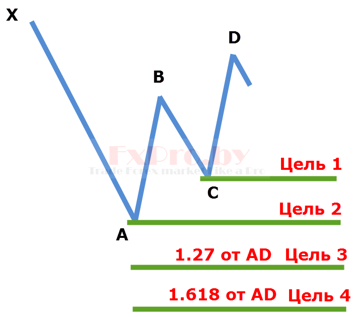 Первая цель располагается на уровне формирования точки C. Вторая цель планируется на уровне формирования точки A. Третьей целью выступает проекция 1.27 от движения AD. Четвертой целью выступает проекция 1.618 от движения AD. Важно понимать, что третья и четвертая цель – это для моделей направленных в сторону предшествующего тренда.