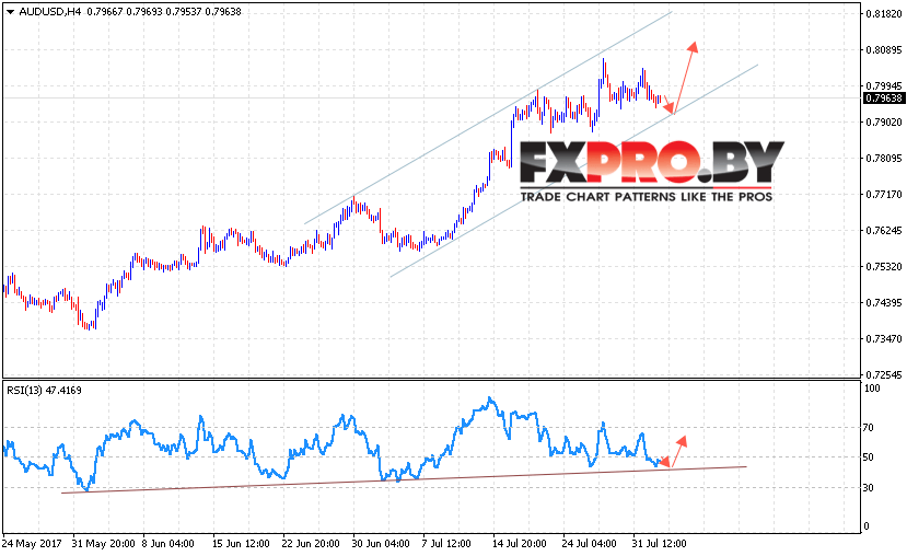 Таким образом, AUD/USD прогноз Австралийского Доллара на 13 июля 2017 предполагает попытку теста нижней границы канала и продолжение роста котировок в область выше уровня 0.8090, дополнительным сигналом станет тест линии тренда на индикаторе относительной силы.
