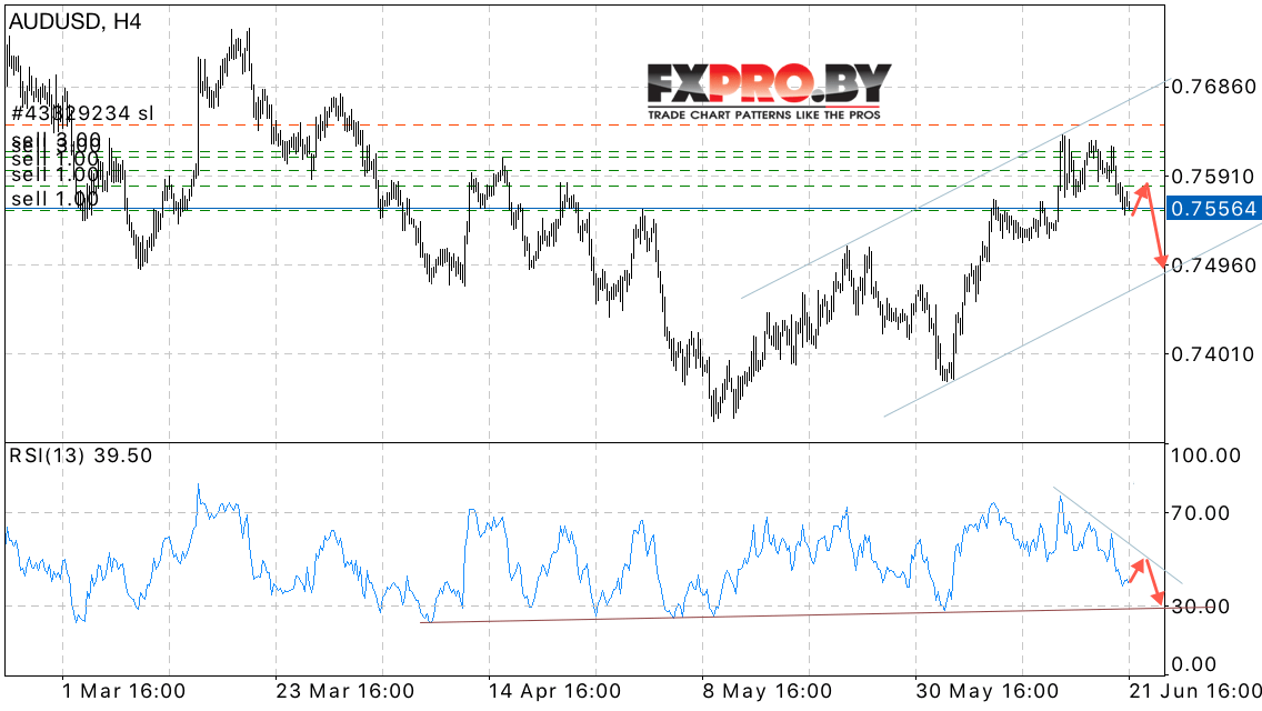 Валютная пара Австралийский Доллар к Доллару США AUD/USD продолжает движение в рамках снижения. На данный момент котировок тестируют область 0.7555. Стоит ожидать попытку теста уровня 0.7580 и продолжения снижения в область ниже уровня 0.7495.