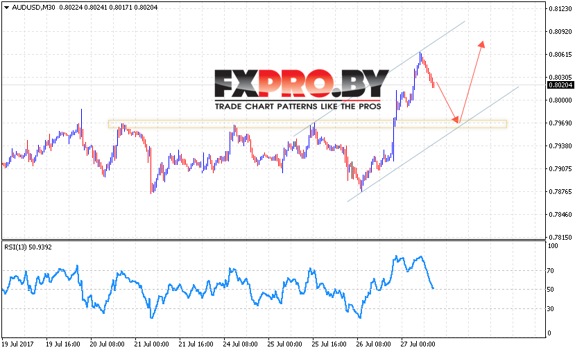 Таким образом, AUD/USD прогноз Австралийского Доллара на 28 июля 2017 предполагает попытку теста нижней границы восходящего канала наравне 0.7970, откуда стоит ожидать отскок и продолжение рост пары с целью выше уровня 0.8080.