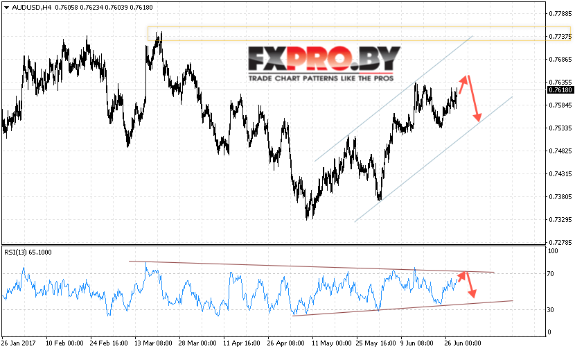 Таким образом, AUD/USD прогноз Австралийского Доллара на 29 июня 2017 предполагает попытку теста области локального максимума и начала падения в область ниже уровня 0.7540, дополнительным сигналом выступит тест линии тренда на индикаторе относительной силы.