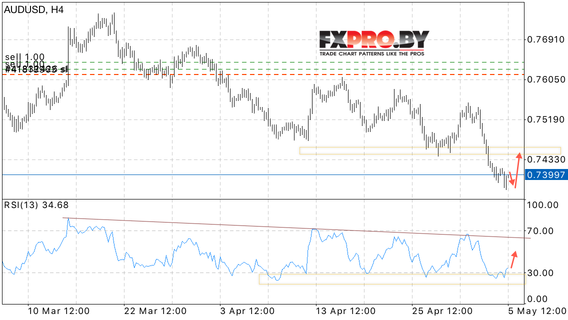 Валютная пара Австралийский Доллар к Доллару США AUD/USD продолжает движение в рамках падения, однако на данный момент котировки тестируют область поддержки. Стоит ожидать попытку коррекции пары в область выше уровня 0.7440.