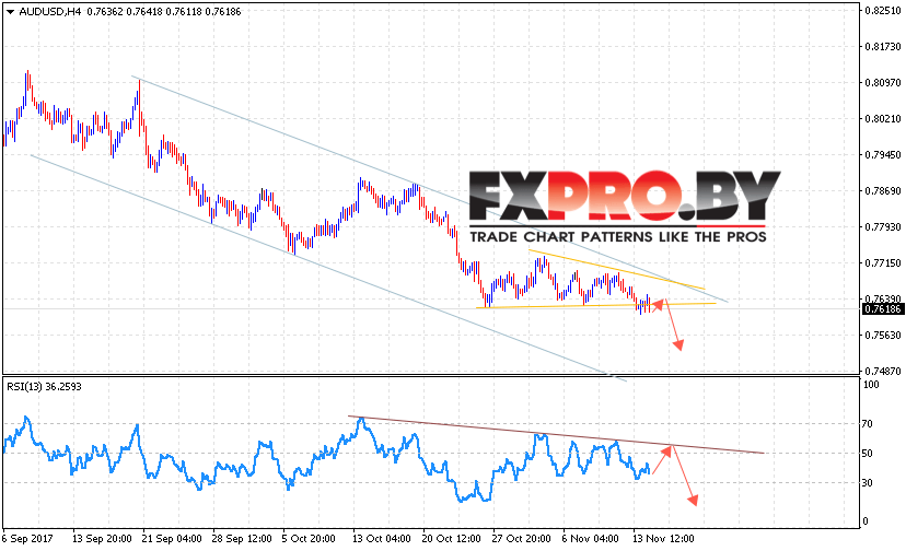 Таким образом, AUD/USD прогноз Форекс и аналитика на 15 ноября 2017 предполагает попытку теста уровня 0.7640, откуда стоит ожидать продолжения падения AUD/USD с целью ниже уровня 0.7550, дополнительным сигналом в пользу снижения выступит тест линии сопротивления на индикаторе относительной силы, отменой варианта падения AUD/USD станет пробой уровня 0.7720.