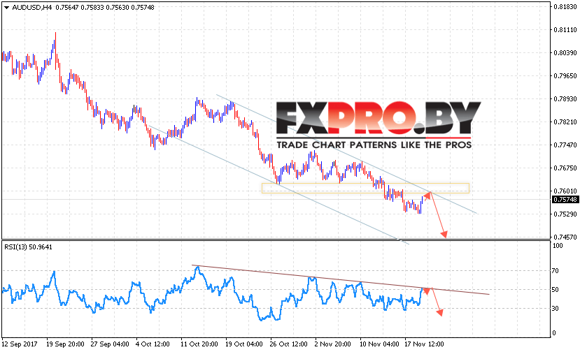 Таким образом, AUD/USD прогноз Форекс и аналитика на 22 ноября 2017 предполагает попытку теста уровня сопротивления вблизи области 0.7590, откуда стоит ожидать продолжения падения AUD/USD с целью ниже уровня 0.7420, дополнительным сигналом в пользу снижения выступит тест линии сопротивления на индикаторе относительной силы, отменой варианта падения AUD/USD станет пробой уровня 0.7650.
