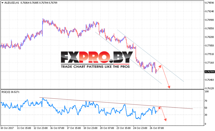 Таким образом, AUD/USD прогноз Форекс и аналитика на 27 октября 2017 предполагает попытку коррекции в область 0.7710 и продолжения падения, дополнительным сигналом выступит тест линии тренда на индикаторе относительной силы.