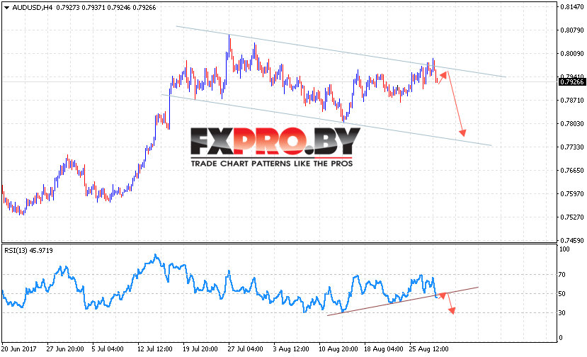 Таким образом, AUD/USD прогноз Форекс и аналитика на 31 августа 2017 предполагает попытку отскока от верхней границы канала с потенциальной целью падения вблизи уровня 0.7800, дополнительным сигналом в пользу падения пары выступает пробой линии тренда на индикаторе относительной силы.