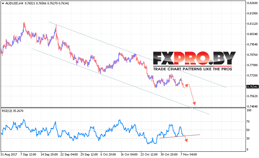 Таким образом, AUD/USD прогноз Форекс и аналитика на 8 ноября 2017 предполагает попытку теста уровня 0.7650, откуда стоит ожидать продолжения падения AUD/USD, дополнительным сигналом в пользу снижения выступит формирование разворотной модели «Голова и плечи», отменой варианта падения AUD/USD станет пробой уровня 0.7750.