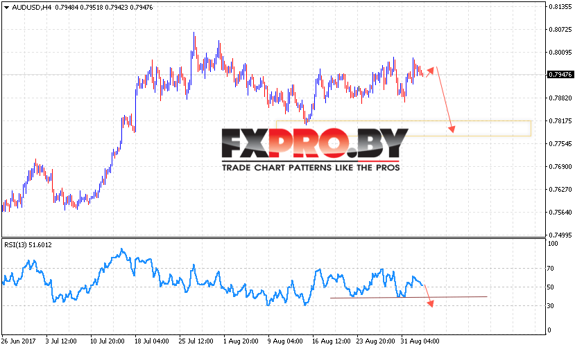Таким образом, AUD/USD прогноз на 5 сентября 2017 предполагает попытку падения с текущих уровней в область ниже 0.78, в пользу падения выступает формирование разворотной модели Голова и плечи на индикаторе относительной силы, отменой станет сильный рост и пробой области 0.8010.