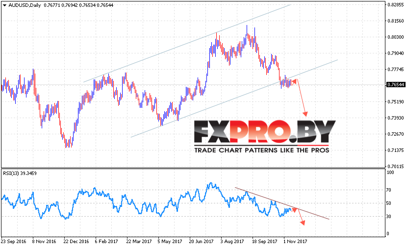 Таким образом, Форекс прогноз AUD USD на 13 — 17 ноября 2017 предполагает попытку отскока от пробитой границы канала и продолжения падения ниже уровня 0.7375, в пользу снижения пары выступит тест линии тренда на индикаторе относительной силы, отменой варианта падения станет пробой области 0.7820.