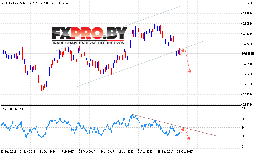 Таким образом, Форекс прогноз AUD USD на 6 ноября — 10 ноября 2017 предполагает попытку отскока от пробитой границы канала и продолжения падения ниже уровня 0.7375, в пользу падения выступит тест линии тренда на индикаторе относительной силы, отменой варианта падения станет пробой области 0.7750.