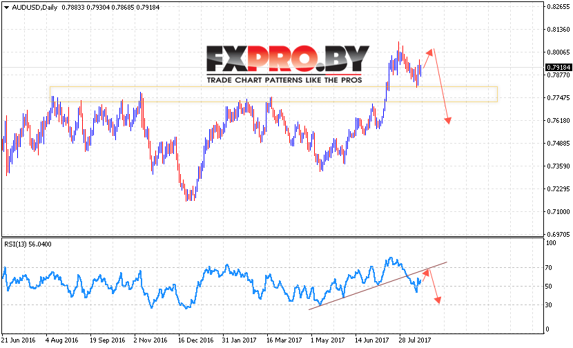 В пользу падения пары выступит тест пробитой линии тренда на индикаторе относительной силы. Отменой варианта падения пары AUD/USD выступит пробой уровня 0.8150, что укажет на продолжение роста Австралийского Доллара. Ожидать ускорения снижения стоит с пробоем уровня поддержки и закрытием котировок ниже области 0.7700.