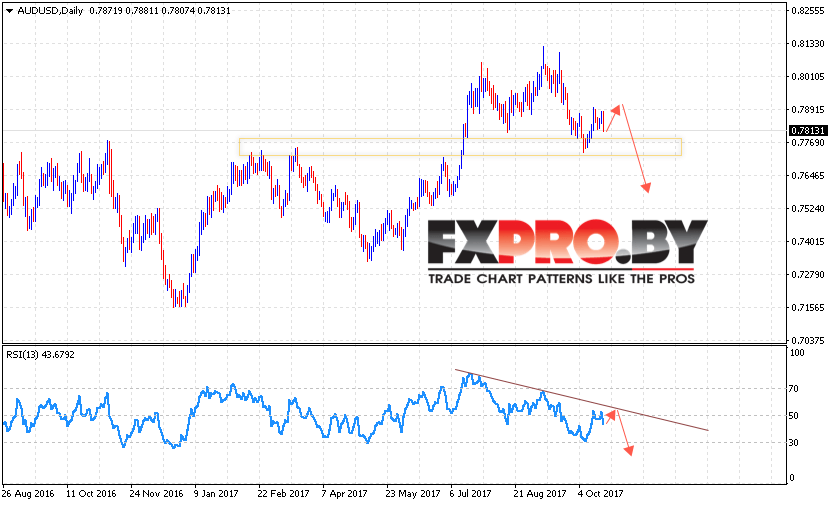 Откуда вновь стоит ожидать продолжения падения котировок AUD/USD в область ниже уровня 0.7630. В пользу падения пары выступит тест линии сопротивления на индикаторе относительной силы. Отменой варианта падения AUD/USD выступит пробой уровня 0.8070, что укажет на продолжение роста Австралийского Доллара на Форекс. Ожидать ускорения падения стоит с пробоем уровня 0.7550.