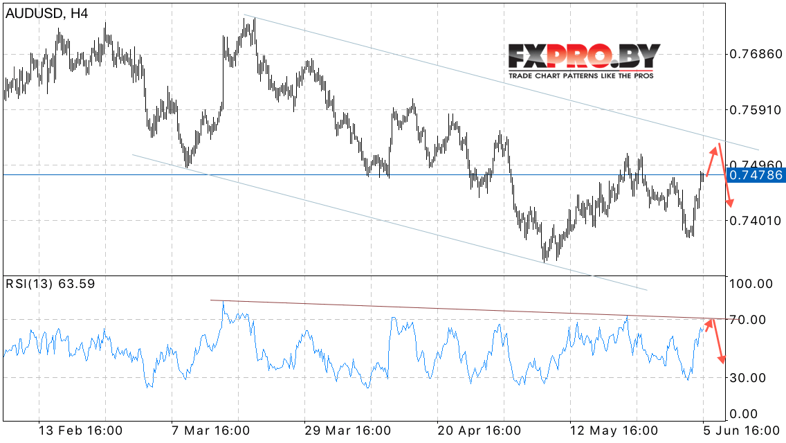 Таким образом, AUD/USD прогноз на 6 июня 2017 предполагает попытку теста верхней границы нисходящего канала, откуда стоит ожидать отскок и продолжения снижения котировок в область ниже уровня 0.74, отменой станет пробой области 0.7540.