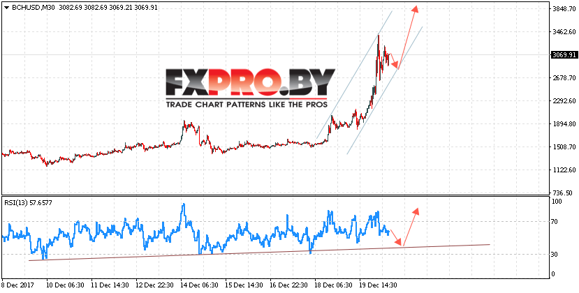 Таким образом, Bitcoin Cash BCH/USD прогноз на 21 декабря 2017 предполагает попытку теста нижней границы канала вблизи области 2700, откуда стоит ожидать отскок и продолжения роста в область выше уровня 3850, дополнительным сигналом в пользу роста Bitcoin Cash выступит тест линии поддержки на индикаторе относительной силы.