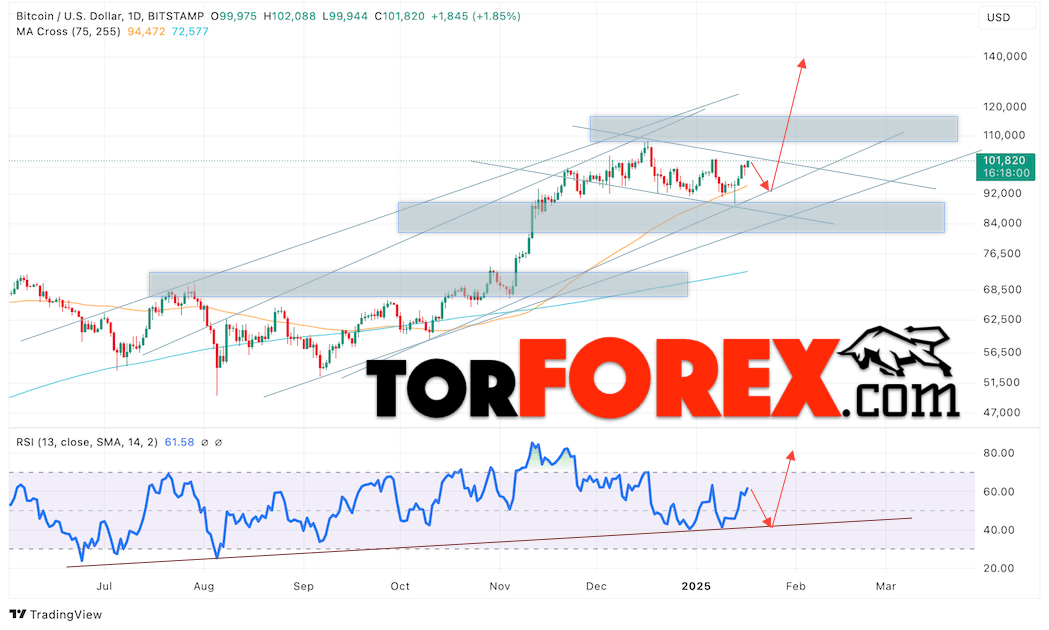 Таким образом, Bitcoin прогноз на неделю 20 — 24 января 2025 предполагает попытку развития медвежьей коррекции и теста уровня поддержки вблизи области 92205. И далее, продолжение роста криптовалюты BTC с потенциальной целью на отметке 138505. Дополнительным сигналом в пользу подъёма курса Bitcoin выступит тест линии тренда на индикаторе относительной силы. Отменой бычьего варианта по Биткоину станет пробой области 84205. Это укажет на продолжение падения монеты с потенциальной целью ниже отметки 75685.