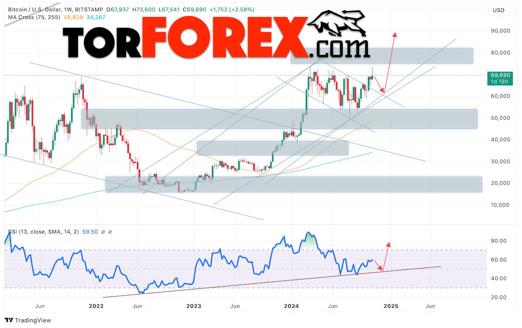 Дополнительным сигналом в пользу роста котировок BTCUSD выступит тест бычьей линии тренда на индикаторе относительной силы. Вторым сигналом в пользу этого варианта станет отскок от нижней границы бычьего канала. Отменой варианта роста курса Bitcoin выступит снижение стоимости монеты и пробой области 58605. Это укажет на закреплением под уровнем поддержки и продолжение падения курса Bitcoin с потенциальной целью на отметке 55405. Подтверждением бычьего сценария на текущей торговой неделе станет пробой области сопротивления с закреплением цены выше отметки 71505.