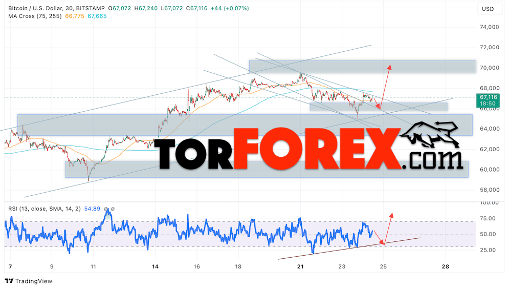 Дополнительным сигналом в пользу роста котировок BTC/USD выступит тест линии поддержки на индикаторе относительной силы. Вторым сигналом в пользу этого варианта станет отскок от верхней границы медвежьего канала, который был пробит покупателями вверх. Отменой варианта роста курса монеты и стоимости Bitcoin станет падение стоимости актива и пробой области 65205. Это укажет на пробой области поддержки и продолжение падения курса Bitcoin с потенциальной целью на уровне 63405. Подтверждением росту цены актива выступит пробой области сопротивления с закреплением цены выше отметки 68055, что укажет на пробой верхней границы нисходящего канала коррекции.