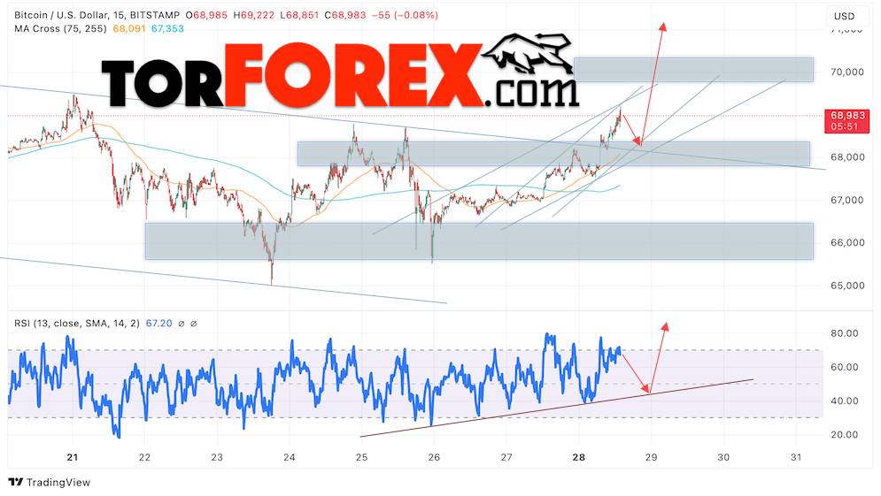 Дополнительным сигналом в пользу роста котировок BTC/USD выступит тест линии поддержки на индикаторе относительной силы. Вторым сигналом в пользу этого варианта станет отскок от верхней границы медвежьего канала, который был пробит покупателями вверх. Отменой варианта роста курса монеты и стоимости Bitcoin станет падение стоимости актива и пробой области 67405. Это укажет на пробой области поддержки и продолжение падения курса Bitcoin с потенциальной целью на уровне 65605. Подтверждением росту цены актива выступит пробой области сопротивления с закреплением цены выше отметки 70045.