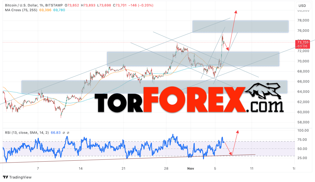 Котировки BTCUSD торгуются на уровне 73701 и продолжают движение в рамках развития роста и бычьего канала. Скользящие средние указывают на наличие краткосрочной бычьей тенденции по Bitcoin. Цены пробили область между сигнальными линиями вверх, что указывает на давление со стороны покупателей «Цифрового Золота» и потенциальное продолжение роста стоимости актива уже с текущих уровней. В рамках прогноза курса криптовалюты на завтра 7 ноября 2024 стоит ожидать попытку развития медвежьей коррекции цифрового актива и тест уровня поддержки вблизи области 72065. Откуда вновь стоит ожидать отскок вверх и попытку продолжения роста курса Bitcoin с целью выше области 79605.