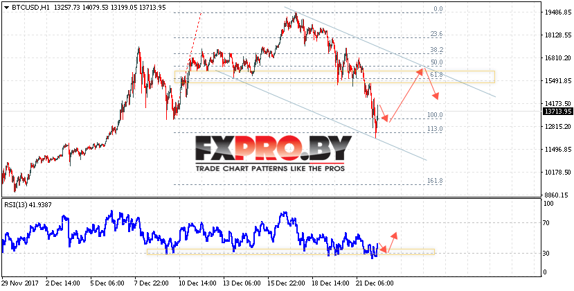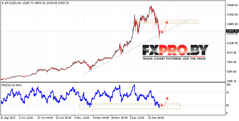 Таким образом, Курс Bitcoin (BTC/USD) прогноз на 23 декабря 2017 предполагает попытку линии тренда вблизи области 13400 и продолжения роста в область выше уровня 15500, дополнительным сигналом в пользу роста курса Биткоин выступит тест области поддержки на индикаторе относительной силы.