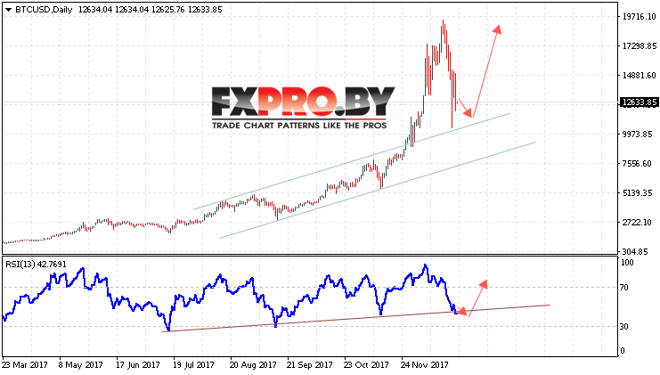 В пользу роста котировок BTC/USD выступает тест восходящей линии поддержки на индикаторе относительной силы. Отменой варианта роста станет падение и пробой области 9500, что укажет на продолжение падения BTC/USD ниже уровня 7500. С пробоем уровня сопротивления и закрытием выше 15000 стоит ожидать подтверждения бычьей тенденции.