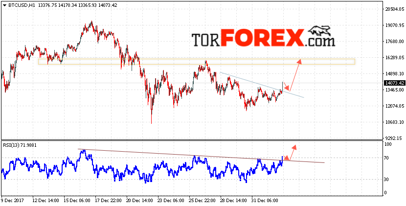 Таким образом, Курс Bitcoin (BTC/USD) прогноз на 3 января 2018 предполагает попытку теста линии «Шеи» вблизи уровня 13500 и продолжения роста в область выше уровня 16300, дополнительным сигналом в пользу роста курса Биткоин выступит тест линии тренда на индикаторе относительной силы.