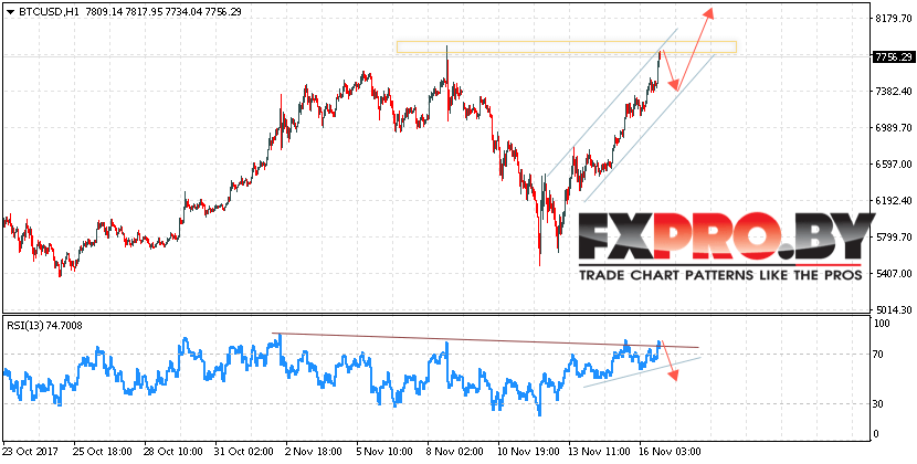 Таким образом, Курс Bitcoin (BTC/USD) прогноз на 17 ноября 2017 предполагает попытку теста нижней границы канала вблизи уровня 7400 и продолжения роста в область выше уровня 8200, дополнительным сигналом в пользу снижения курса Биткоин выступает тест линии сопротивления на индикаторе относительной силы.