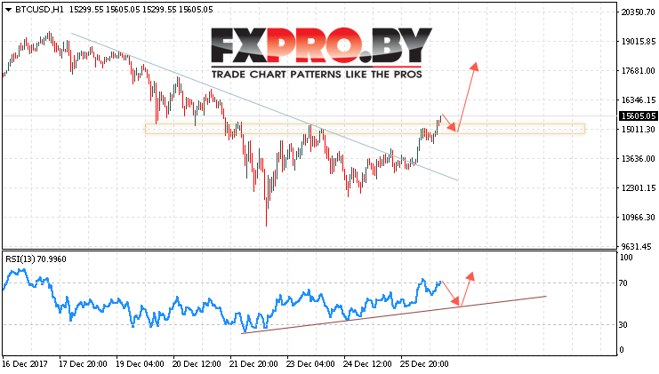 Таким образом, Курс Bitcoin (BTC/USD) прогноз на 27 декабря 2017 предполагает попытку уровня 15100 и продолжения роста в область выше уровня 17600, дополнительным сигналом в пользу роста курса Биткоин выступит тест линии тренда на индикаторе относительной силы.